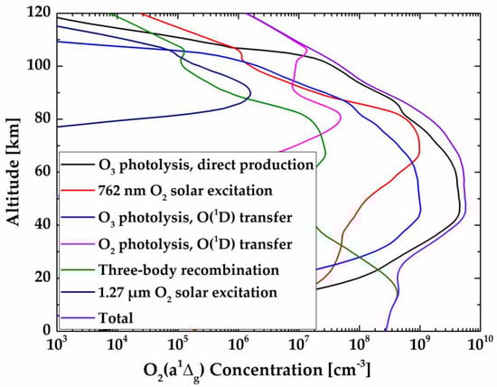 With the values of the rates of photodissociation and photoexcitation and the values of the rate constants of the processes considered by Yankovsky et al. [17,19], the O2(a1Δg) number density, , can be calculated assuming photochemical equilibrium. Figure 3 shows the amounts of O2(a1Δg) attributable to each source of predominant mechanisms. The source corresponding to each curve is described and marked in the figure legend. It is apparent from this figure that the primary source for O2(a1Δg) is generated directly upon photolysis of O3. The coproduct O(1D) through energy transfer emerges as the secondary, parallel contribution and dominates the emission process above 100 km. The photoexcitation-induced becomes a major contributor between 65 and 85 km.