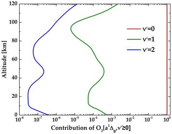 As described above, O2(a1Δg, v’ = 0) distribution is in collisional and chemical balance. At lower altitude, the quenching-related decay of O2(a1Δg, v’ = 0) is significant because the probability of quenching determines the lifetime of O2(a1Δg, v’ = 0), while at higher altitude, the local thermodynamic equilibrium (LTE) is broken because of the presence of constant sources of excited molecular oxygen due to O2 and O3 photodissociation. O2(a1Δg) is formed mainly by photolysis of O3 in the Hartley band below about 100 km and by energy transfer from O(1D) above that altitude [20,22]. The collisional quenching of O2(b1Σg) with N2 and O2 also contributes to the production of O2(a1Δg), especially at 65–85 km. Thus, the distribution of O2(a1Δg, v’ = 0) is not strongly connected to the kinetic temperature and cannot be given by the Boltzmann distribution. This behavior is referred to as nonlocal thermal equilibrium (non-LTE).
