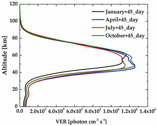 Figure 5 shows the calculated volume emission rate (VER) profiles of the O2 infrared atmospheric band under daytime condition in the four seasons in the Northern Hemisphere (simulated by taking the mid-latitude for example). As is apparent, there are only minor differences between different seasons. The VER for the summer illuminated atmosphere (July) is slightly larger at low altitude. The major reason for this behavior is the consequence of larger solar illumination at north latitude in summertime. The spring volume emission becomes the largest over the altitude region from 30 to 50 km because the ozone content is the most abundant in spring.