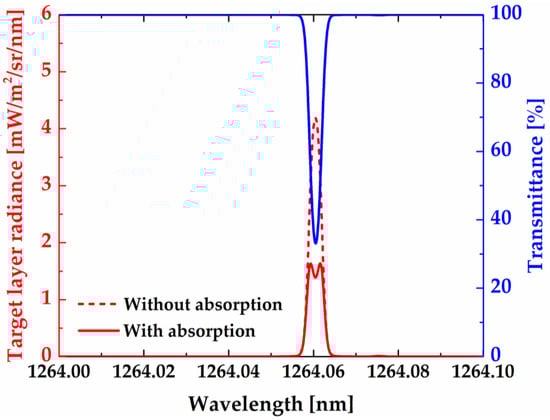 Figure 9 shows the spectral brightness and the atmospheric transmittance of a relatively strong line (R9Q10 at 1264.06 nm) of O2 infrared atmospheric band at the tangent height of 50 km. For comparison, the spectral line brightness neglecting self-absorption is also displayed in the same figure. As illustrated, the self-absorption of the R9Q10 line is significant even at 50 km tangent height. As a type of Doppler line shape, the value of the absorption cross section is large at the line center and decreases toward the two wings, so the process of self-absorption leads to a spectral line broadening for the emission line. Due to this broadening effect, the WAMI, MIMI, and NWTSI instruments cannot provide meaningful Doppler temperature, and the rotational temperatures need to be measured by observing relative radiation intensity of three rotational lines.