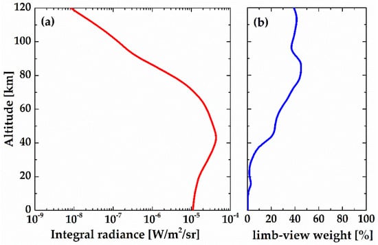 The integral radiance (a) and limb-view weight (b) of the R9Q10 line varying with the tangent altitude.