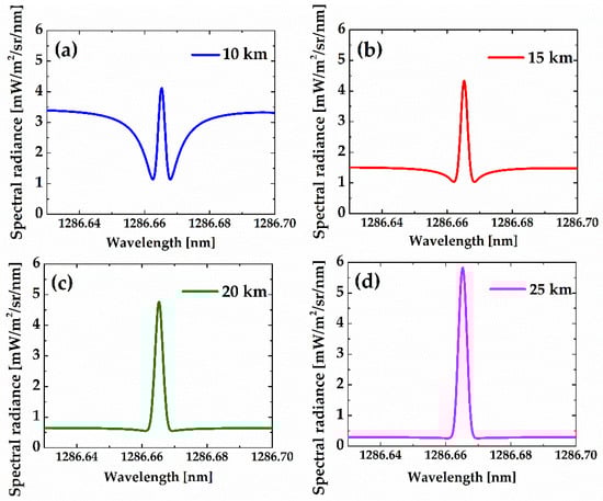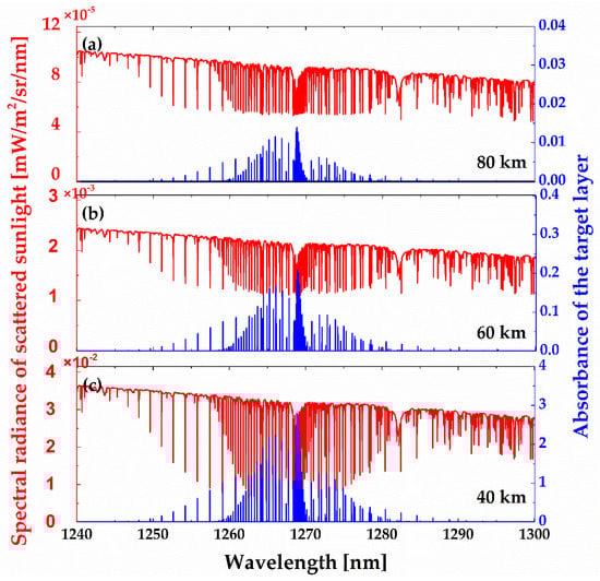 Figure 11 shows the limb spectral radiance of the scattered sunlight at 1.27 μm and the absorbance of the target layer at tangent heights of 40, 60, and 80 km. The spherical adding and doubling methods developed by Abreu, et al. were adopted in this work [26]. As illustrated, the scattered sunlight radiance as well as the absorbance of the target layer goes down exponentially with tangent height. The O2 absorption spectrum is quite similar to limb emission spectrum in shape (shown in Figure 8), while emission lines are much narrower than absorption lines because pressure broadening can be ignored at high altitude. They also have different distributions in spectrum because the emission rate and the absorption cross section are influenced differently by atmospheric temperature due to their different populations of rotational levels (as noted before).