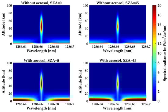 The SZA and atmospheric aerosol have significant influence on both the asymptotic value and line center intensity. Figure 15 shows the variations in total spectral brightness with the SZA and atmospheric aerosol at the tangent heights from 0 to 100 km. Wavelength is the abscissa, tangent height is the ordinate, and the scale of the spectral brightness is made by the pseudo color intensity in each graph. Several features are apparent in this figure. The asymptotic intensity increases by approximately two times when the SZA grows from zero to 45°. The impact of this effect can be explained by Mie and Rayleigh scattering phase functions: scattering angle becomes smaller as the SZA increases, and the decreasing scattering angle leads to an increase in scattered signal. The variation in the line center is not as large as it is in the asymptote. This behavior is due to the fact that the intensity in the line center depends not only on the amount of scattered light but also on absorption and emission. The variation in the SZA changes the path length of the solar radiation passing through, which causes a change in the solar energy being deposited at different heights. As the column densities through the O2 and O3 increase, the optical depth increases, while the photolysis rate decreases. At tangent heights above 80 km, the SZA has a smaller effect on the O2(a1Δg) concentration because of the gradual disappearance of O3. The production of O(1D) becomes the dominant source of O2(a1Δg), and this production steadily decreases with the SZA. The atmospheric aerosol is important in determining the asymptotic intensity. Similar to SZA, the center intensity is not a strong function of the atmospheric aerosol. The center intensity variations with Mie scattering are mostly due to changes in extinction coefficient caused by the existence of aerosol. Changes in the intensity of the absorption feature at low tangent height lines of sight are masked by the dominant emission feature of the mesosphere.