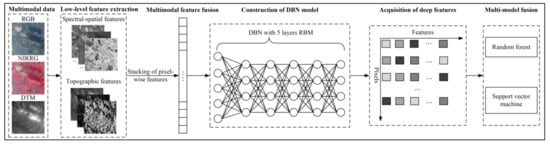 The framework of multimodal and multi-model deep fusion strategy. RGB: ZiYuan-3 true color image with red, green, and blue bands. NIRRG: ZiYuan-3 false color image with near-infrared, red, and green bands. DTM: digital terrain model. DBN: deep belief network. RBM: restricted Boltzmann machine.