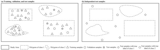 The schematic diagram of developing training, validation, and test samples and the spatially independent test samples (taking two classes as example).