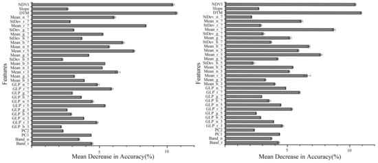 The average and standard deviation values of mean decrease in accuracy for different features in feature subset 1 (left) and 2 (right). As for features’ name, see Li et al. [12] for detail.