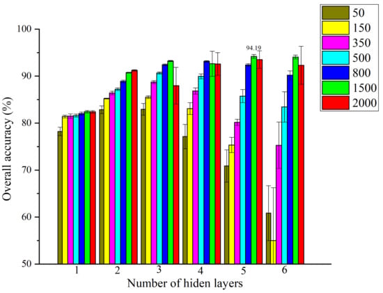 For deep feature extraction using the DBN-S model, two parameters were optimized. The first group of training and validation sets was used, and the process was repeated five times. The depth was set between 1 and 6, and the node was set to one group of values (50, 150, 350, 500, 800, 1500, and 2000). Moreover, to simplify the optimization process, it was assumed that the node was the same in each hidden layer. Meanwhile, the activation function, , epoch, and the mini-batch size were set to sigmoid, 0.0001, 800, and 2048, respectively. The combination of 5 and 1500 was selected for the depth and node (Table 4), which yielded the highest average OA of 94.19% ± 0.39% for validation set 1. The average and standard deviation of the OA for validation set 1 derived from different parameter combinations are depicted in Figure 8.