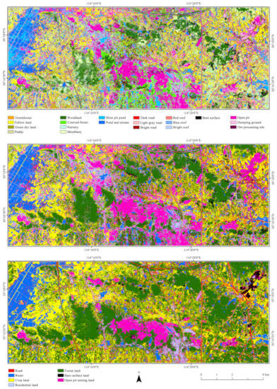 This study was focused on the FLCC of CMALs. Consequently, the second-level LCC scheme described in Li et al. [12] was selected. It includes the following: four types of crop land (i.e., paddy, greenhouse, green dry land, and fallow land); four types of forest land (i.e., woodland, shrubbery, coerced forest, and nursery); two water classes (i.e., pond and stream and mine pit pond); three road classes (i.e., dark road, bright road, and light gray road); three types of residential land (i.e., bright roof, red roof, and blue roof); one bare surface land; and three types of open pit mining land (i.e., open pit, ore processing site, and dumping ground).