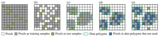 In this study, five groups of training, validation, and test sets were constructed based on a set of data polygons, with 2000, 500, and 500 samples, respectively, for each class (Table 2). The fractions of all of the sets and data polygons are shown in Table 2. The data polygons were collected based on those drawn in Li et al. [12] and using visual interpretation technology. For details, some polygons were added for the mine pit pond, dark road, red roof, and blue roof classes. The polygons for the open pit, ore processing site, and dumping ground classes were completely re-delineated (Table 2) [12]. The three sets were randomly selected from the data polygons and were independent of each other. Some spatial auto-correlations [62] existed. For example, the total pixels of three sets for some classes accounted for over 20% of the corresponding data polygons. The training and validation sets were used for parameter optimization and model development while the test set was employed for an accuracy assessment. In regard to the land covers, see Section 3.3.2. Figure 5a illustrates the schematic diagrams of the training, validation, and test samples, and Figure 5b depicts the spatially independent test samples (for details, see Section 3.3.3).
