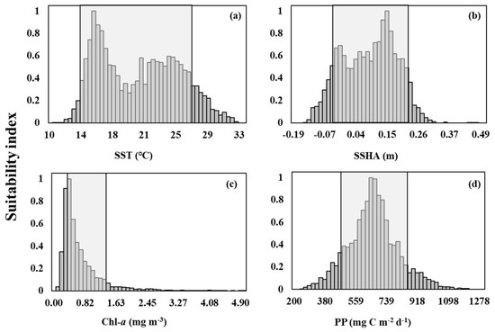 - Chen, X.; Li, G.; Feng, B.; Tian, S. Habitat Suitability Index of Chub Mackerel (Scomber Japonicus) from July to September in the East China Sea. J. Oceanogr. 2009, 65, 93–102. [Google Scholar] [CrossRef]