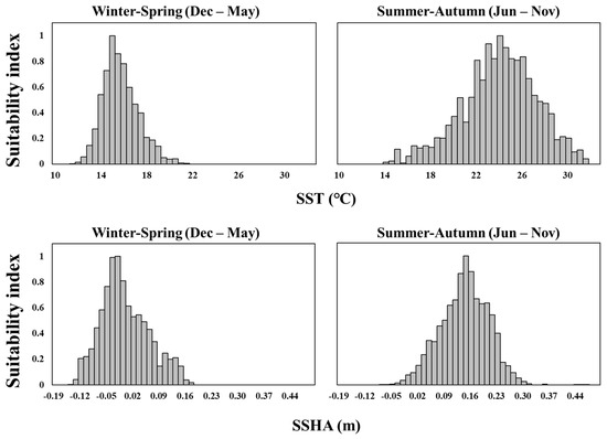 - Lee, D.; Son, S.; Kim, W.; Park, J.; Joo, H.; Lee, S. Spatio-Temporal Variability of the Habitat Suitability Index for Chub Mackerel (Scomber Japonicus) in the East/Japan Sea and the South Sea of South Korea. Remote Sens. 2018, 10, 938. [Google Scholar] [CrossRef]