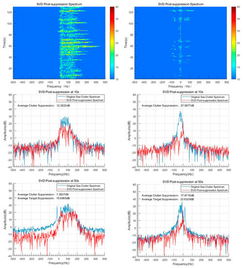 The parameters for SVD suppression are the same as those in the previous section. It can be seen that the strong clutter components in the offshore area are almost suppressed, but in the far-sea area, the main clutter component has almost no suppression effect in the frequency domain close to or equal to zero. It can also be found that in the far-sea area, since the added virtual target is very similar to the first-order Bragg peak, SVD suppresses both of the symmetrical virtual targets. It can be concluded that SVD has a lesser suppression effect when the main components of the clutter, like the far-sea area, are small and symmetrical with respect to the zero frequency. When the target frequency is obviously symmetrical around the zero frequency, its ability to retain targets is worse.