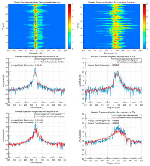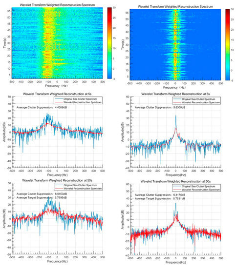 The wavelet transform handles the spectrum of sea clutter. According to the different wavelet scales of the target and sea clutter in the spectrum, the wavelet weighted reconstruction can be carried out (we need to know where the target is in the spectrum), to achieve the maximum retention target and suppress sea clutter. However, when the target is hidden by the sea-clutter component, the suppression effect of the wavelet transform is not good. It can be seen that when there is no target, or when the target is hidden by the clutter (in fact, the wavelet scale of the frequency is not much different from that of other frequency points), the wavelet transform can suppress the clutter component and smooth the waveform in the frequency domain. When the virtual target and the strong sea-clutter component are separated in the frequency domain, the wavelet transform is still ideal for the preservation of the virtual signal, but there is still no way to improve the SNR for a signal that is hidden by sea clutter.