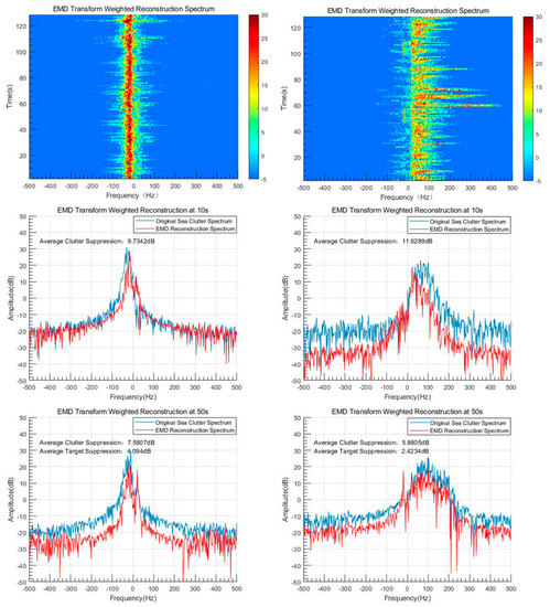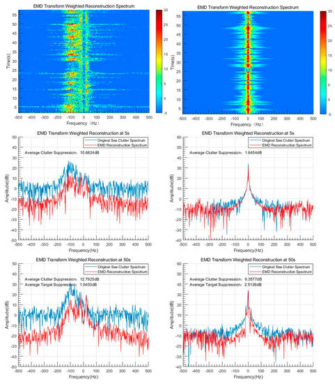 It can be seen from the above figure that EMD reconstruction can achieve good results in suppressing clutter and retaining targets in both near- and far-sea areas. It can be clearly seen from the figure that the frequency-suppression point of the target is about 1 dB, and the frequency of the main component of the clutter is much larger than 1 dB, so the effect of improving the SNR can be achieved. It can be concluded that the EMD reconstruction method can achieve a better suppression of clutter, superior retention of signals, and greater improvement of the SNR for known target information. Moreover, when the main components of the clutter in high sea conditions and offshore areas are widely spread in the frequency domain, we can obtain better suppression effects.