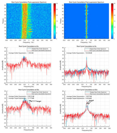 The cycle number of the root cycle cancellation in the offshore area is 60 times. When the spectrum of the suppression clutter is greatly widened, the loop cancellation has almost no effect and will suppress the target signal instead. Since the spectral broadening of the main component of the clutter in the far-sea area is narrow, the number of cyclic cancellations is chosen to be 10. Given a narrow spectrum of clutter, the suppression of cyclic cancellation is still good. Since the cyclic cancellation method mainly eliminates the harmonic peaks with high amplitude in the frequency domain, it can be clearly seen that the two virtual targets that are obviously symmetric in the frequency domain at 50 s are first suppressed. At the same time, it can be seen that the root cycle cancellation method has almost zero suppression at zero frequency. It can be concluded that the root loop cancellation method has a much weaker suppression effect when the main components of the clutter are broadened. When the target frequency is significantly symmetrical around the zero frequency, its ability to retain the target is worse.