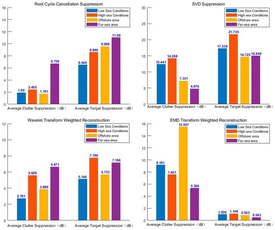To improve radar’s ability to detect targets such as ships against a background of strong sea clutter, the IPIX radar dataset is used to compare and analyze the suppression effect of root cycle cancellation, singular-value decomposition (SVD) suppression, wavelet weight reconstruction, and empirical mode decomposition (EMD) reconstruction methods on sea clutter and virtual signals in four conditions: high-sea-state, low-sea-state, offshore areas, and far-sea areas. The main findings are as follows: