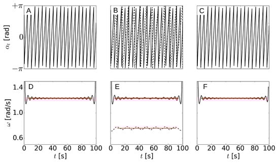Angle of the Pricipal Component (PC) (A–C) and frequency (D–F) for the monochromatic (A,D), bichromatic (B,E), and reflective (C,F) 1D cases versus time: First (second) mode is in solid (dashed) lines. Red lines are for the mean angular frequencies.