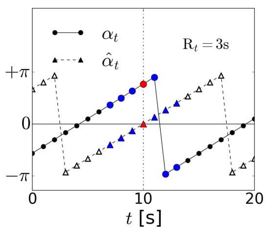 The wave angular frequency (just frequency hereafter) at a certain time  is to be determined by fitting the angle of the PC in a vicinity of radius  around , making use of Equation (7a). However, to prevent the discontinuities in , the latter is first centered at ,