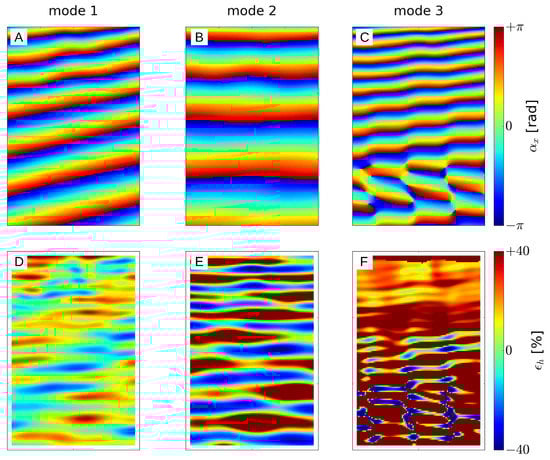 Phase fitting without windowing of the three modes of the linear polychromatic wave field WS for , , , and :  (A–C) and  (D–F).