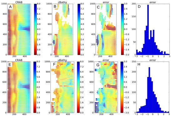 On top (bottom) are results from cBathy (uBathy). From left to right: measured bathymetry with the CRAB (A,E, in m), inferred bathymetry (B,F, in m), error of the inferred bathymetry (C,G, in m), and histogram of the errors for the pixels (D,H).
