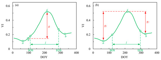 We canceled the base value (d) and instead propose using two different amplitudes when retrieving SOS and EOS (g1 and g2, Figure 2b). The amplitude used in the retrieval of SOS is the difference between c and the minimum VI value on the left side (a), as shown by g1 in Figure 2b. Correspondingly, the amplitude used in retrieving EOS is the VI maximum value of the growing season (c) minus the VI minimum value of the right side (b), as shown by g2. The calculations of SOS and EOS thresholds are summarized in Equation (4).