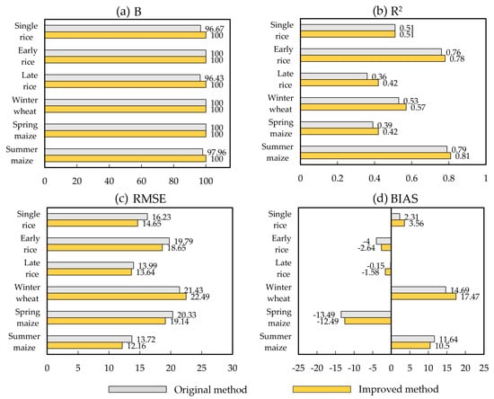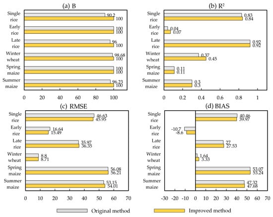 Comparison of the end of the season (EOS) retrieval results before (gray bars) and after algorithm improvement (orange bars), and both are based on the 20% amplitude threshold (a) B, (b) Coefficient of determination (R2), (c) Root Mean Square Error (RMSE), (d) BIAS.