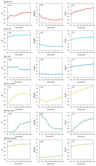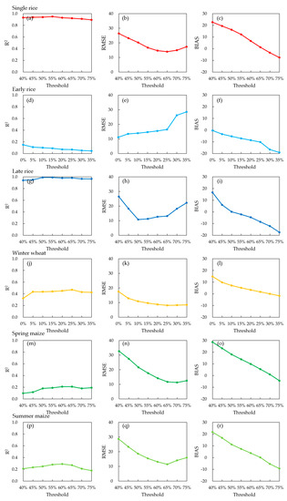 The optimization procedure for EOS was the same as that of SOS, but the pre-selected threshold range was from 0% to 35% for early rice and winter wheat, respectively, and the range was from 40% to 75% for the other crops. The results are shown in Figure 6. For most crops, as the threshold gradually increases, the R2 increases first and then decreases. At the same time, the other statistics show the opposite trend. Only for early rice, the R2 gradually decreases and never exceed 0.2. For single rice, spring maize, and summer maize, the optimal threshold is between 60% and 70%. For late rice, the optimal threshold is about 50%. For winter wheat and early rice, the optimal threshold is less than 30%, especially for early rice, which is approximately 0%.