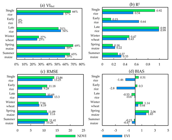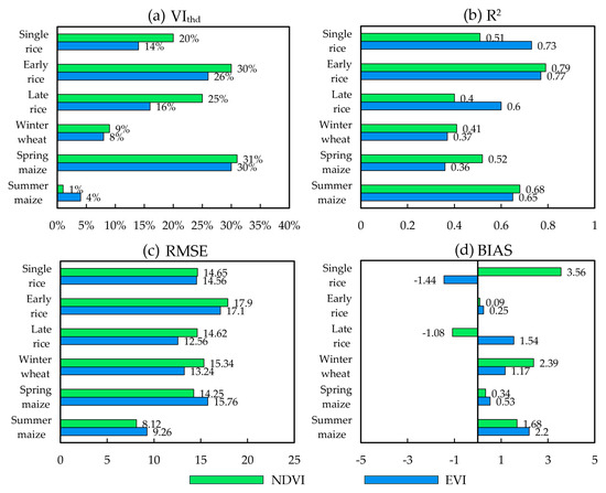 The optimal thresholds and the corresponding accuracies of the retrieved the end of the season (EOS) based on Normalized Difference Vegetation Index (NDVI) (green) and Enhanced Vegetation Index (EVI) (blue). (a) The optimal threshold (VIthd), (b) Coefficient of determination (R2), (c) Root Mean Square Error (RMSE), (d) BIAS.