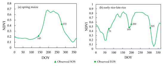 As expected, the optimal SOS thresholds for crops planted in single cropping, and for the first crops of double cropping, are generally higher than those of other crops. Similarly, for EOS, the optimal thresholds for crops planted in single cropping, and the second crop of double cropping, are generally higher than those of other crops. This interesting phenomenon is rooted in the principle of the method itself. Indeed, the left or right minimum VI under those conditions are usually found during the winter months of January or December. During winter, usually extremely low vegetation cover is observed and the vegetation index is generally much lower compared to the rest of the year. Therefore, the threshold has to be relatively high to counterbalance the higher dynamic range in those situations (g1 and g2 in Figure 2b). For the other crops, however, the left minimum and the right minimum are the harvest period of the first crop. Crop maturity of the first crop and the emergence of the second crop are close to this point, which leads to smaller optimum threshold values. An example confirming this interpretation is shown in Figure 9 with the NDVI time-series of two ground stations: (a) single cropping with spring maize, and (b) double cropping of early rice-late rice.