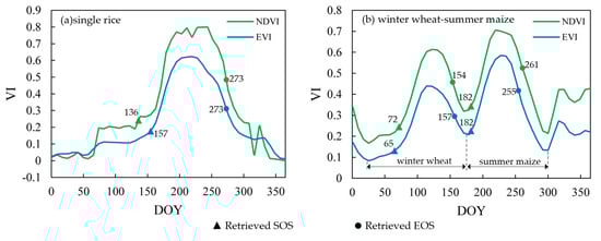 According to Figure 7 and Figure 8, the optimal thresholds for retrieving SOS based on NDVI are generally slightly higher than those based on EVI. Moreover, for crops planted in single cropping (such as single rice and spring maize), the optimal threshold to retrieve EOS based on NDVI were significantly higher than those based on EVI. Taking single rice as an example, the optimal threshold for retrieving EOS based on NDVI is 66%, while the optimal threshold based on EVI is 57%. This finding mainly relates to the shape and amplitude of NDVI and EVI time series. Figure 10 shows an example of the NDVI and EVI time series of two stations for (a) single rice and (b) winter wheat-summer maize. As shown in Figure 10a, the amplitude and slope of NDVI time series are larger than the ones of the EVI time series in the growing season. Therefore, the optimal threshold for retrieving EOS needs to be larger. On the contrary, for SOS, the observation date is located at the position where the slope rises. Hence, there is little difference in the optimal threshold for retrieving SOS based on NDVI and EVI. In addition, as shown in Figure 10b, compared with the single-growing crops, the differences in shape and amplitude between NDVI and EVI time series of double-cropping are smaller. Therefore, the differences between the optimal thresholds for retrieving SOS and EOS from NDVI and EVI are also smaller.