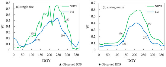 The accuracies of the SOS results for single rice and late rice based on EVI are generally higher compared to NDVI. However, for spring maize and summer maize, we obtain opposite findings. In terms of EOS, for early rice and summer maize, results based on EVI have higher accuracy, but, for late rice and winter wheat, results based on NDVI are closer to the ground records. As an example, Figure 11 shows the NDVI and EVI time series from (a) a single rice station and (b) a spring maize station. As shown in Figure 11a, compared with NDVI, EVI has stronger anti-interference ability for the soil background, and is less influenced by noise. For low spatial resolution data (such as MODIS), most of the corresponding pixels in paddy rice fields are mixed pixels, which are often seriously affected by the surrounding land cover. Therefore, the phenology retrieval accuracy based on EVI is higher when compared to NDVI. However, as shown in Figure 11b, NDVI is more sensitive to chlorophyll than EVI, which leads to a larger growth amplitude that permits us to monitor vegetation growth more sensitively. When using remote sensing data of higher spatial resolution, the phenology retrieval accuracy of some crops based on NDVI may be higher [49,50].