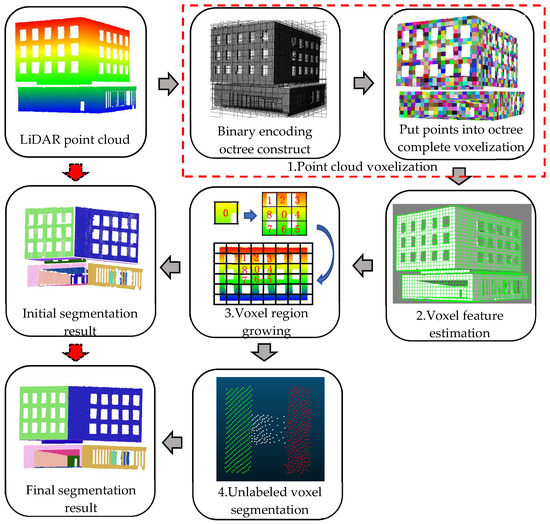 The process of the EVBS algorithm is shown in Figure 1, which includes four main steps: (1) Using a highly efficient binary-coded octree to voxelize the point cloud, which can realize a fast voxel adjacency search; (2) estimating the features of each voxel, including the spatial position, normal vector, and residual value of the voxel; (3) clustering voxels using a region growing algorithm, in which the effects of residual value and number of points in voxels are considered while selecting a reasonable seed voxel; smoothness and continuity constraints are used as two main constraints for region growing; (4) refining point clouds in unlabeled voxels by judging the relationship between points and the segmented plane to improve the recall rate and accuracy of plane segmentation.