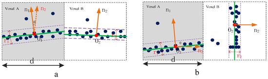 - Continuity constraint: To judge whether points in two adjacent voxels belong to the same plane, it is insufficient to rely solely on the smoothness constraint. As shown in Figure 6b, the normal vectors of two adjacent voxels are parallel to each other, satisfying the smooth connection constraint; however, the point clouds of the two voxels do not belong to the same plane. Therefore, the parameter D in the plane equation should also satisfy the corresponding conditions to ensure that the points in the two voxels belong to the same plane. We call this constraint the continuity constraint. The continuity constraint of the voxels implies that if the points in two voxels belong to the same plane, then the two parts of the points are continuous, as shown in Figure 6a. To measure the continuity between two voxels, we compute the centroids , of voxels A and B, respectively, and then connect the centroids of two voxels to obtain vector . Before applying the continuity constraint, the smoothness constraint is first applied; in other words, the smoothness constraint is satisfied before the continuity constraint is applied. Therefore, the normal vectors of the two voxels are approximately parallel before the continuity constraint is applied. If ( is the normal of voxel A), the points in two voxels are considered to be continuous and cluster them into the same plane. If , then the point clouds in two voxels do not satisfy the continuity constraint. is the threshold. This can solve the problem of clustering the parallel planes which are close to each other into the same plane (shown in Section 4.3).