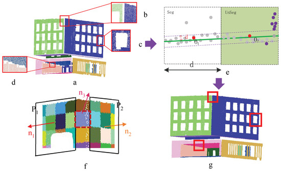 After the region growing segmentation of a voxel, points belonging to the same plane can be clustered into one group, and a set of point cloud planes can be obtained, as shown in Figure 7a. Although the point cloud planes are segmented correctly in the initial segmentation, there is a phenomenon of under-segmentation which caused by two main reasons: (1) the normal of voxel at the junction of two or more planes differs significantly from the normal of these planes, thus it is impossible for them to be clustered into any plane, as shown in Figure 7f; furthermore, because of the large residual value, they cannot be selected as a seed to grow a new plane, as shown in Figure 7b,d. (2) Some voxels are not clustered because of incorrect normal vector calculations owing to noise points, as shown in Figure 7c. To address under-segmentation, this paper allocates the points in unsegmented voxels correctly by judging the relationship between the plane of adjacent voxels that have been segmented from unsegmented voxels and the points in unsegmented voxels. First, we place the unsegmented voxels into a set and then traverse each unsegmented voxel in and find its adjacent voxel set . Next, we record the index of the plane in which voxel is located, and . Subsequently, we calculate the distance from each point in to these planes, as shown in Equation (10).