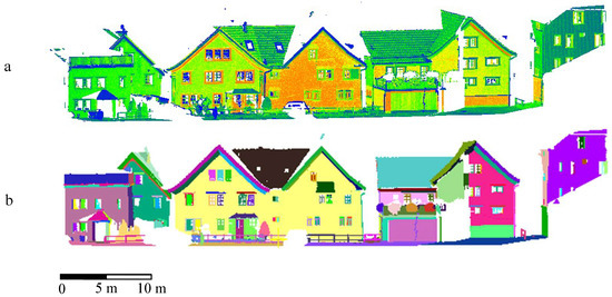 The purpose of this algorithm is to segment a point cloud into point cloud planes. Sawtooth usually at the boundary between two connected planes which decreases the accuracy of plane segmentation in other methods [38,39,40]. In our paper a method of subdividing each point in an undivided voxel at the junction of two or more planes is adopted to segment point cloud data correctly, thus avoiding the sawtooth appearance of plane boundary points. However, in some scenes, a curved surface point cloud appeared. As shown in Figure 16, the point cloud at the junction of eaves and walls of the data in Section 3.1 is curved, and its boundary with the point cloud on the wall is not obvious. Therefore, the voxel residual value of this part is small and can grow to a certain plane in the initial growth, which will also result in the appearance of a sawtooth point cloud plane boundary, as shown in Figure 16a. However, in this study, we do not consider the segmentation of a curved surface point cloud. If the voxel resolution is set reasonably, this phenomenon will not be obvious and thus the segmentation results will not be affected significantly. Other circumstances, such as the segmentation of sphere, cylinder, cone, etc., will be the focus of our next stage research.