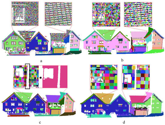 A voxel-based segmentation algorithm regards a voxel as a segmentation object, and the voxel at the junction of planes often contains points that belong to two or more planes. The VGS algorithm directly clusters voxels and does not process voxels separately at the junction of planes. Therefore, when the voxel resolution is large, a sawtooth point cloud plane boundary will appear, which results in non-ideal segmentations, as shown in Figure 13c. Because the residual value (represented by the normalized parameter herein) of voxels at the plane junction is large, our algorithm does not directly classify these voxels in the initial segmentation; subsequently, during refinement segmentation, we judge the relationship between each point in an unlabeled voxel and the segmented plane to avoid this phenomenon, thus improving segmentation, as shown in Figure 13d. As shown in the segmentation results in Table 3, the comprehensive metrics F1 of EVBS is 0.81, which is higher than 0.69 of the VGS. In terms of efficiency, the VGS algorithm requires 49.3 s to segment mobile laser scanner data, which is better than the general point-based plane segmentation algorithm; meanwhile, the EVBS only requires 5.1 s, which is better than the VGS. The experimental results show that the EVBS performs well in the plane segmentation of complex scene point cloud data.