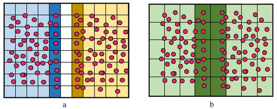 In the case of urban scenes, the abundant parallel facades bring difficulties to plane segmentation [41]. During voxel-based region growing, voxels with the same plane features are clustered into one group. For example, in Vo’s paper, a voxel normal is selected as the clustering condition for the voxel region growing [24]. However, according to the plane equation, it is insufficient to determine a plane by only the normal. When two planes are parallel and close to each other, it is easy to divide two planes into one plane according to the rule of region growing of adjacent voxels. Figure 17b shows two parallel planes that are close to each other. Figure 17c shows their side view and the result of voxelization. If only the normal of the voxel is selected as the growing constraint, the two grey voxels shown in Figure 17c will be clustered into one group; subsequently, these two parallel planes will be clustered into the same point cloud plane, as shown in Figure 17d. Therefore, according to the plane equation, we consider the spatial position relationship between the two voxels and add the constraint of continuity to cluster the voxel. When the spatial position of two adjacent voxels does not satisfy the set continuity threshold, the two voxels will not be clustered into the same plane; therefore, the parallel and adjacent planes will be separated correctly, as shown in Figure 17e.