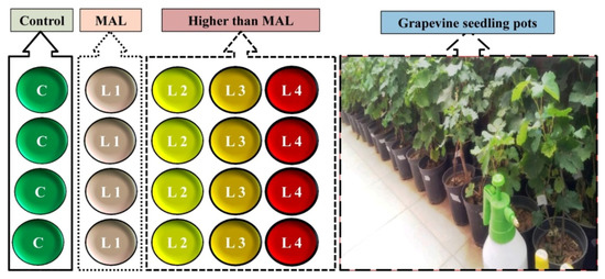 Schematic design of the treatment for each studied metal (C: control, L1 to L4: level 1 to level 4 stressed, MAL: maximum allowed level) and image of applied grapevine seedling pots.