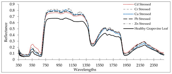 The average reflectance spectrum of a healthy grapevine vs. stressed grapevine leaves due to heavy metal stress is shown in Figure 2. In the VIS region, the light absorption rate of the stressed grapevine was drastically decreased. This is due to the fact that the spectral characteristics of plants in this region are regularly motivated by pigments [64,65]. Accordingly, this suggests that heavy metal stress reduced pigment contents. Various spectral characteristics between healthy and stressed leaves can also be observed in the RDE, NIR, and MIR regions (Figure 2). As Vogelmann [66], Slaton et al. [23], and Strever [67] stated, plant pigments do not absorb the light in the NIR and MIR regions; therefore, the plant leaf reflectance is significantly increasing in these regions. Additionally, the spectral characteristics of plant leaf in the NIR and MIR regions were changed by structure/morphology and water contents, respectively [54]. According to Figure 2, in the NIR and MIR regions, a lower reflectance was observed in healthy grapevine leaves as opposed to the stressed grapevine. Although other driving variables such as structural parameters and water contents were not measured in this study, it can be concluded that the stress caused by heavy metals had a significant effect on the leaf optical properties.