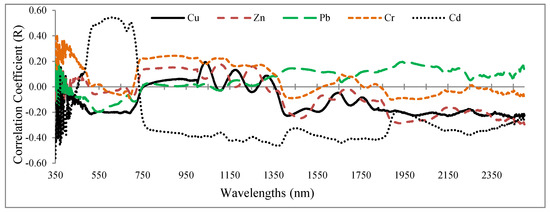 Correlation coefficient between the heavy metal concentration (determined by laboratory analysis) and spectral response of grapevine leaf samples (350 to 2500 nm).