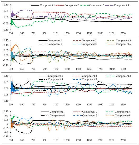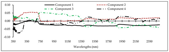 Determining the optimal wavelengths to monitor the desired plant parameters within the vast hyperspectral bands is one of the most critical operations in spectroscopy [43,46,56]. Commonly, a small number of wavelengths/spectral indices are selected with maximum performance for the study purpose, while missing data should be minimal [46,68]. Thus, we chose the PLS method because of its high adaptability with hyperspectral data to recognize optimal predictive variables (wavelengths and spectral indices) for estimating heavy metals in grapevine leaves [42]. Identifying the fit number of components is one of the most imperative factors in applying the PLS results because the number of components can directly determine the number of model input variables. Accordingly, the cross-validation algorithm was applied to optimize the number of PLS components [43], and then the optimum variable for each of the components was identified. Figure 4 shows the number of optimal components and the wavelength factor loads of the metals studied. This figure shows that the numbers of developed fit components were 4, 6, 5, 6, and 4, for Cu, Zn, Pb, Cr, and Cd, respectively. Therefore, based on the introduced components, the wavelengths and spectral indices which had the highest correlation with the components were identified. They can be subsequently used as optimal spectral wavelengths and indices in the relevant modelling process, especially for estimating metal concentrations in the grape leaves [43].