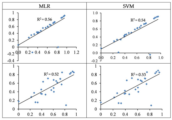 The standardized values (between 0–1) of the observed (horizontal axis) and the predicted (vertical axis) concentration of Cr based on wavelengths (top) and spectral indices (bottom) in the testing sets of the SVM and MLR methods.