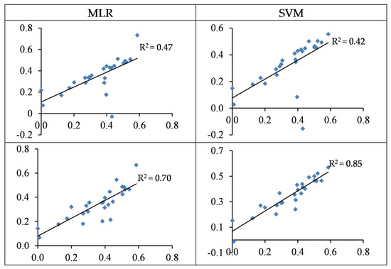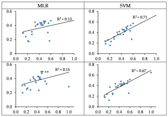 Standardized values (between 0 and 1) of the observed (horizontal axis) and the predicted (vertical axis) concentration of Cu based on wavelengths (top) and spectral indices (bottom) in the testing sets of the SVM and MLR methods.