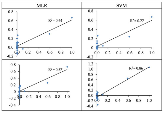 The standardized values (between 0–1) of the observed (horizontal axis) and the predicted (vertical axis) concentration of Cd based on wavelengths (top) and spectral indices (bottom) in the testing sets of the SVM and MLR methods.