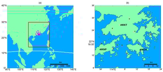 Thunderstorm and GNSS data from 2014 to 2017 were employed in the study. According to the solar-flux index, 2014 was a high activity year and 2017 was a low activity year (https://www.swpc.noaa.gov/). Thunderstorm data were detected by a local lightning-detection network that we developed and established in Southern China (magenta points in Figure 1a). The lightning-detection network can provide the location and magnitude of thunderstorm activity. The GNSS observation data with a 30 s sampling were collected from the public website of the Hong Kong Geodetic Survey Services (https://www.geodetic.gov.hk/; red points in Figure 1b). Here, multi-system GNSS data, including Global Positioning System (GPS) and GLObal NAvigation Satellite System (GLONASS), were employed to increase data coverage. BeiDou System (BDS) data have been available since 2016 and were not used in this study to maintain data-coverage consistency across all years [25,26]. Considering that the distance between adjacent stations was only about 8–15 km, only three stations, HKKT, HKNP, and HKOH, located in the north, west, and east of the network, were selected. The study area is located in the low latitudes of the northern hemisphere, from 106° to 122° East, and 14° to 30° North (red rectangle in Figure 1a), which was selected according to data coverage.