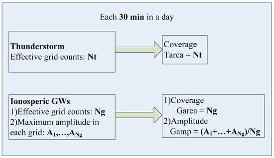A method described by Lay et al. [23] was employed in the statistical analysis. The study area was gridded onto a 0.5° × 0.5° longitude–latitude grid, and the time interval was set to 30 min. Thunderstorm coverage and ionospheric GW coverage during each 30 min time period were recorded. We used the effective grid counts to represent the coverage. If a grid cell surpassed 3 lightning stroke counts, then that cell was effective [24]; if a grid cell surpassed the amplitude threshold of ionospheric GWs, then that cell was effective. Furthermore, the maximum amplitude of each effective grid cell for ionospheric GWs during each 30 min time period was also recorded, and the average maximum amplitudes of the effective grid cells during each 30 min time period were computed (Figure 2). In the following, we use “coverage” and “amplitude” to simply represent the recorded parameters.