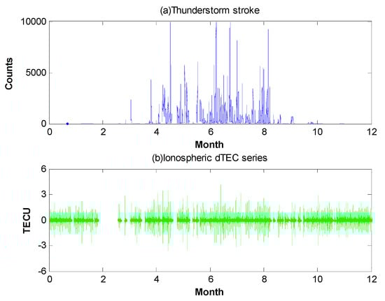 (a) Thunderstorm stroke counts recorded by a local lightning network in 2014; (b) ionospheric dTEC series observed by the GNSS station, HKKT, in 2014.