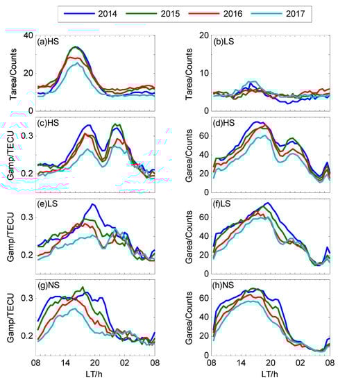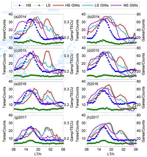 As shown in Figure 4, thunderstorm activity presented an obvious diurnal variation on HS days for each year. Thunderstorm coverage slowly increased at the beginning, began to accelerate at about 11:00 LT (local time), and peaked at around 15:00–17:00 LT. From there, it began to decline with an approximately symmetric pattern. The diurnal variation curve is like a convex function. Thunderstorm activity on LS days showed a similar diurnal pattern to that of HS days, although coverage was very low. It was apparent that ionospheric GW activity also presented a diurnal variation on all days for each year.