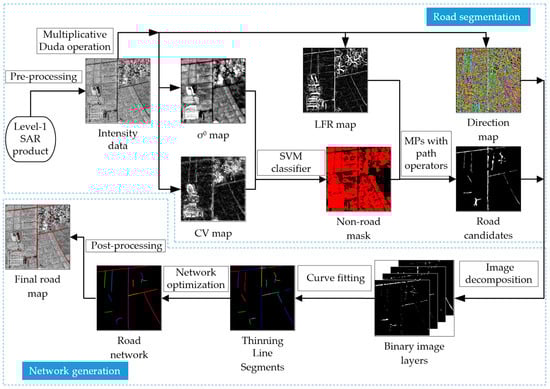 Roads are typical man-made objects that play an essential role in modern transportation systems. Especially in an emergency, for instance, when serious natural disasters occur, real-time road information is vital for emergency rescue. Therefore, accurate and timely road information extraction is considered to be essential. Synthetic aperture radar (SAR), with its imaging capability in all-weather and all-time, has become a popular tool to obtain road information. With the development of SAR technology, SAR sensors have been able to provide daily high-quality images with different modes. Taking TerraSAR-X as an example, the resolution can be of the order of 20 cm in staring spotlight mode []. Nevertheless, complete road detection from SAR images is still a challenging task because of the unique imaging mechanism of SAR, the diversity of road types, and the variable complex situations surrounding the road.