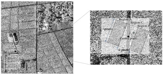 where is the response of multiplicative Duda operation with the window at site (See Figure 2), is the mean intensity value of region C in the window which has the maximum response. Since roads have low surface roughness and low permittivity [], the value of roads is very low and often comparable to the SAR sensor noise level. The CV measures the heterogeneity of a region and is defined as